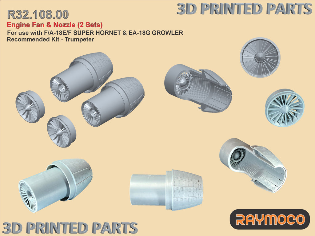R32.108.00 1/32 Engine Fan & Nozzle (2 Sets). For use with F/A-18E/F Super Hornet & EA-18/G Growler. Recommended Kits -Trumpeter